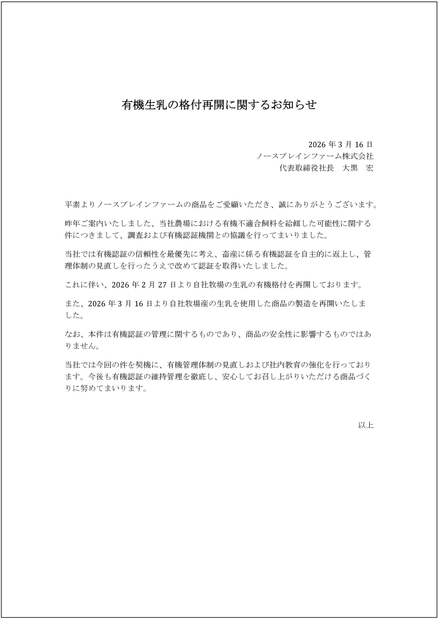 昨年ご案内いたしました、当社農場における有機不適合飼料を給餌した可能性に関する件につきまして、調査および有機認証機関との協議を行ってまいりました。